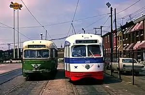 ![]() Two PCC streetcars at the Richmond-Westmoreland Loop in May 1976. | |
