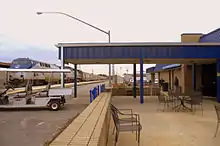 The station has an indoor waiting room with restrooms, a snack bar, and a ticket window.