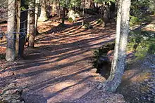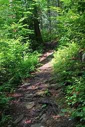 Ricketts' stone house served as the base for the Ozone hiking club of Wilkes-Barre's excursions on the mountain; the club gave its name to Ozone waterfall in the park.[30] In 1879 Ricketts started the North Mountain Fishing Club, for anglers on the lake and creek. Guests of the hotel paid one dollar to fish as a club member. In 1889 Ricketts hired Matt Hirlinger and five other men to build the trails along the branches of Kitchen Creek and its waterfalls. It took them four years to complete the trails and stone steps through the glens.[16][31]