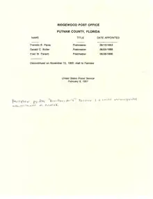 Ridgewood[1][2] is an unincorporated community located in Putnam County, Florida, United States. Situated two miles east of Welaka and 3 1/4 miles southwest of Pomona Park, it is located at latitude 29° 28' 13.8432 North, longitude 81° 38' 43.4400 West. First settled in 1871, by 1883 Ridgewood had a population of 100 with a post office, one store, two steam saw mills and a public school. The hard freezes of the 1890s destroyed most of the citrus crops in the area and as a result the community declined. In the years ahead, a forest fire was said to have destroyed the remainder of the town during the 1920s. All that remains of Ridgewood is a cemetery, now known as the Welaka-Georgetown Cemetery but was once known as Ridgewood Cemetery. Putnam County records show the first burial was recorded in 1917. Mail ran on Monday, Wednesday, Friday and Saturday. Unimproved land sold from $5 to $30 per acre. Application to start a post office by Franklin B Parse was submitted May 30, 1883 to the United States Postal Service, approved and appointed June 15, 1883[3]