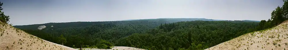 Riding Mountain National Park rises more than 457 metres (1,499 ft) over the surrounding Manitoba farmland.[31] Riding Mountain is the highest point in the region, bordered by the Manitoba Escarpment in the east, the Valley River and Wilson River in the North, and a valley in the west. Further to the west is the Saskatchewan Plain.[32]