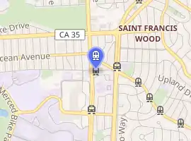 Right Of Way/Eucalyptus is a light rail stop on the Muni Metro M Ocean View line, located in the Merced Manor neighborhood of San Francisco, California. It opened in 1925 with the first phase of the line. The station is located where the line's private right-of-way crosses Eucalyptus Drive, with narrow side platforms located on the near side of the grade crossing. The southbound platform is across the tracks from the northbound platform of Right Of Way/Ocean station.