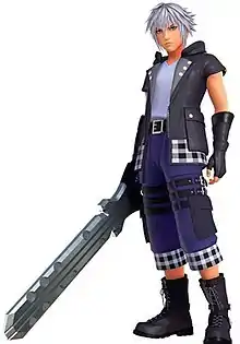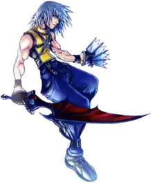 Riku is a childhood friend and rival of Sora, who resides with him and Kairi on the world of Destiny Islands.[18][19] Originally appearing as a non-playable character in the original game, where he is introduced as a 15-year-old boy, during the invasion of Heartless in Kingdom Hearts, Riku immerses himself in darkness to discover new worlds beyond his home. Arriving at Hollow Bastion, Riku is manipulated by Maleficent into aiding her plans for world conquest in exchange for knowledge to restoring Kairi's missing heart. His signature weapon is the "Soul Eater" sword, a manifestation of the darkness in his heart. During the first game, Riku is revealed to be the rightful owner of Sora's Keyblade, which is bequeathed onto the five-year-old Riku by Terra during the events of Birth by Sleep; however, his reliance on the power of darkness causes the Keyblade to reject Riku in favor of Sora.[20] He is later tricked into allowing Xehanort's Heartless, Ansem, to possess his body. Following Ansem's defeat, Riku helps Sora and King Mickey close the door to Kingdom Hearts, remaining on the other side with the king.[21][22]