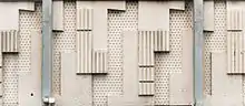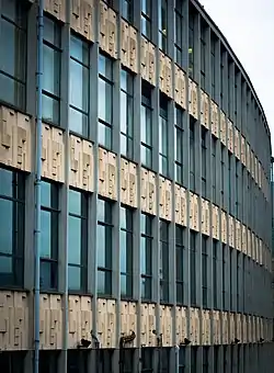 The façade of the building has a blend of thin concrete mullions, bands of windows and relief panels.[2] The pre-cast abstract geometric relief panels are similar in form to the works of Ben Nicholson. There are projecting sculptural concrete trough uplighters which highlight the relief panels at night.[2] In the centre a glazed section bridges Hurst Street on a pair of ribbed splayed concrete piloti, the building was carried over Hurst Street to ensure the continuous sweep of the building along the south side of the road.[2][7]