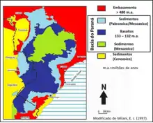 ![]() Extent of Paleozoic (including the Rio do Rasto Formation) and Mesozoic units in the Paraná Basin in light blue | |
