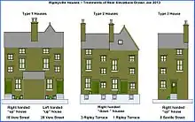 Architectural punctuation of the terraces' front elevations was provided by tall gables to the terminal and central houses. In the north section the outer terraces had gables intermediate between the central and terminal houses. Different designs of gable window were used in different terraces. Left and right handed houses were used to provide symmetry. In a left-handed house the front door was to the left of the ground floor window. In a-right handed house it was to the right. The handedness changed in the centre of the terrace and was marked by a gable house. Between the gable house and its partner was a double chimney stack. Thus there were no chimney stacks on the terminal walls of the terrace and each terminal wall had a front door adjacent to it.