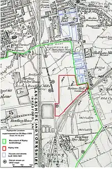 In 1865 more than 80 acres of Ripley's land holding were still undeveloped. The area was dotted with the Bowling Iron Company's former mine workings. Several old mine shafts had been converted to wells to provide the dye works with its soft water supply. Ripley Ville occupied most of the Broom Hall Estate: Broom Hall was a working farmhouse into the 1860s. The northern part of the estate had been acquired by the Great Northern Railway Company (GNR) to build the Bowling Curves that opened in 1867. The site chosen for Ripley Ville had the disadvantage being irregularly shaped with steep gradients. Its central street fell 40 feet over a distance of 300 feet but it was relatively free of old mine workings and contiguous to the urban development along Hall Lane which gave access to the town centre.