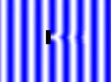 If an obstacle with a small gap is placed in the tank the ripples emerge in an almost semicircular pattern. If the gap is large however, the diffraction is much more limited. Small, in this context, means that the size of the obstacle is comparable to the wavelength of the ripples.