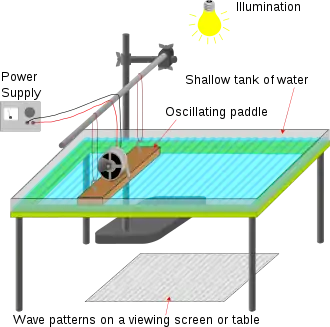 In physics, a ripple tank is a shallow glass tank of water used to demonstrate the basic properties of waves. It is a specialized form of a wave tank. The ripple tank is usually illuminated from above, so that the light shines through the water. Some small ripple tanks fit onto the top of an overhead projector, i.e. they are illuminated from below. The ripples on the water show up as shadows on the screen underneath the tank. All the basic properties of waves, including reflection, refraction, interference and diffraction, can be demonstrated.