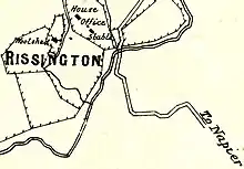 In November 1851, the Crown purchased the Ahuriri block for £1,500,[6] described in 1855 as, "a million of acres at Ahuriri for a penny-three-farthings" an acre.[7] However, the land around the Mangaone wasn't surveyed until 1861, when most of it was still under dense bush.[8] There were reports of totara being floated down the river from the 1860s[9] and two timber mills were still running in 1916.[10] From 1861 the cleared land was used for large sheep stations, which were gradually split into smaller farms. Roads and other facilities spread, until cars and roads improved to put Rissington within a half hour journey from Napier, after which the area lost its post office, store, library hall and school.