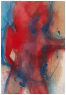 Ackermann received her first major survey exhibition in 2011, at the Ludwig Museum of Contemporary Art in Budapest. The exhibition's title, “BAKOS,” is also the artist's family name. The exhibition presented her recent paintings, especially her now well-known Fire by Days series, a highly distilled collection of images based on two colours and a single composition. This series was also exhibited with Hauser & Wirth in London in 2012, Ackermann's first presentation with the gallery after joining their roster. ‘Fire by Days’, a title inspired by French poet Roger Gilbert-Lecomte’s ‘Vacancy in Glass’, began as an accidental spill of paint on the artist's studio floor, which Ackermann mopped up using a Hungarian fire safety poster.[8] Of these paintings, Ackermann has said: “These paintings came to me from, or as, an accident: suddenly the forms and shapes of hastily cleaning up a mess of paint on a surface suggested something that wasn’t a figure or a face, but rather both, or abstract. This is how the first ‘Fire by Days’ images arose. I had no intention to make this picture. It was an accident.”[9]
