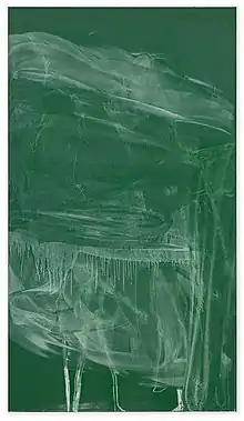 This body of work was collectively titled The Chalkboard Paintings. These works were presented together in a solo exhibition at Malmö Konsthall in 2016, and examined the relationship Ackermann's earliest and most recent body of work, created more than two decades apart. In doing so, the viewer was invited to experience the multiplicity of layers, textures, and dichotomies of meanings in the artist's work. Her large paintings of “nymphet-ish” girls depicted with lines evoking both beauty and ugliness, which had brought Ackermann widespread acclaim in the 90s, can be seen as the point of departure for The Chalkboard Paintings. Ackermann described the process of creating her chalkboard paintings: “These works are made by multiple erasures. What happens through the making is exactly what happens on a chalkboard in a classroom. A configuration or drawing is rendered on the black or green board; then it gets cleaned up for the next class. Since I apply the chalkboard paint on the canvases first, they must be stretched on the wall. The erasures are forceful and physical. I discovered that sometimes the more manic the erasure is, the more visible the drawing becomes underneath the layers of washed-away chalk dust. A considerably “unnoble” material's fragility and modesty – the chalk – turns out to be the greatest resistance.”[12]