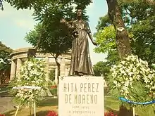 Multiple times her name and memory have been honored for being an outstanding heroine of the movement, for which she was made with the name of Mexican independence. Her name is inscribed in gold letters in the Assembly Hall of the Legislative Power of the State of Jalisco by decree number 8,473 of January 4, 1969.[6] In 2010 it was announced that the remains of Rita Pérez Jiménez would be transferred to the Rotunda of the Jalisco Illustrious.[7] The act had been considered in 1955 by Agustín Yáñez, governor of Jalisco, but after an investigation it was determined that the remains of the heroine had become part of the common ossuary of the San Juan de los Lagos cemetery in 1927 , so it could not be done. Finally, during the seventh session of the Culture Commission of the Jalisco State Congress, Deputy Rocío Corona Nakamura commented that the State Institute of Forensic Sciences confirmed that the remains exhumed from the tomb of Rita Pérez de Moreno are legitimate.7 On August 27, 2010, the remains of the heroine arrived at the Rotunda of Illustrious Jaliscienses after a ceremony with a funeral procession that began at the Government Palace together with the unveiling of her statue created by the sculptor Rubén Orozco Loza.[8][9]