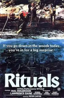 Rituals is a 1977 Canadian slasher film directed by Peter Carter, and starring Hal Holbrook, Lawrence Dane, and Robin Gammell. It centers on a group of doctors who are stalked and murdered while on a wilderness trip in remote Northern Ontario. The film was also released under the alternate title The Creeper.