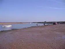 From here the river enters Overy marshes and Overy Creek. The river spreads out into multiple tidal creeks through the salt marshes that fringe the coast thereabouts, and finally leaves land and enters the sea between the eastern point of Scolt Head Island and Overy Marshes, the gap locally known as Burnham Harbour. Small boats can reach Burnham Overy Staithe through this gap and creek.