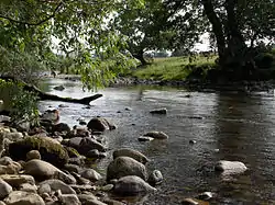 At Hutton Roof, the river emerges from the dale and turns sharply northwards, a course taking it through the settlements of Hesket Newmarket, Sebergham, Buckabank and Dalston. At Buckabank the river flows over a weir that provides a mill stream to the cotton mill and there is a salmon ladder. Flowing under Hawksdale Bridge at Bridge End and Dalston's two other bridges (Jubilee Bridge and the White Bridge) the river then flows towards Cummersdale where another weir used to exist above the now modernised textile mill.
