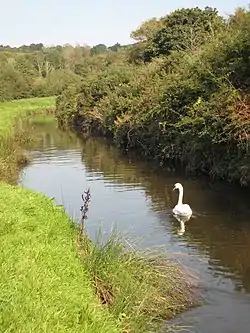 It rises in Nine Maidens Downs, directly between Hangman's Barrow to the west and the Nine Maidens stone circle to the east, in the former Kerrier District and runs to the west of the town of Helston before entering the largest natural lake in Cornwall – Loe Pool.[2] The water is impounded by the natural barrier, Loe Bar, and the river system can be traced several kilometres out into Mount's Bay.[3] Mining activity of over one hundred years in the river catchment, ceased in 1938, in the Wendron and Porkellis mining districts; and the engine house of Castle Wary (also known as Wheal Pool), near Nansloe can still be seen on the east side of the river below Helston. The lower reaches of river was canalised in 1946 and a causeway built over Loe Marsh in 1987.[4] The meaning of the name is uncertain, but two of the earliest records are: "in 1260 we find, 'Chohor' [alternately known as in non-unified Cornish: Dowr Coghar, meaning 'scarlet river'], due to its earlier colour from mining waste and a few years later, 'Coffar'".[5] The present name 'Cober' is unlikely to be derived from 'Coffar', since it was known as the 'River Loe or River Looe' around four hundred years ago, in Carew's time, according to the map of Powder Hundred.[6]