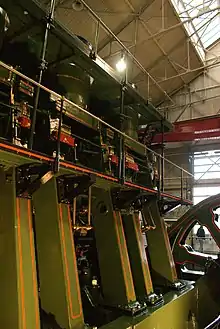 The River Don Engine is a 1904-built steam engine used for hot rolling steel armour plate.[1] It is a 3-cylinder simple engine of 40 inches (1.0 m) diameter, 48 inches (1.2 m) stroke. At its operating steam pressure of 160psi, it developed 12,000 horsepower (8.9 MW), and was able to reverse from full speed in 2 seconds. The rapid reverse was an essential feature of an engine used for rolling, as delays would result in cooling of the workpiece. This engine was one of four built to the same design, one going overseas to the Japanese Government, one to John Brown's Atlas plant, and the destination of the final one being William Beardmore of Glasgow. It is claimed to be one of the most powerful steam engines ever built, and the most powerful remaining in Europe.[2]
