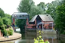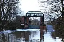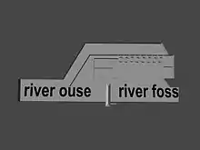 The River Foss Barrier is a floodgate that straddles the River Foss in York, England at the confluence of the Rivers Ouse and Foss just south of Clifford's Tower. The barrier was opened in 1988 after flooding from the Foss and two other becks caused more damage to properties in the city than when the Ouse was in spate. The purpose of the barrier is to prevent backing up of floodwater from the Foss when it meets the surgewater of the Ouse and cannot drain away.[1] The pumps adjacent to the barrier move water from the Foss into the Ouse.[2]