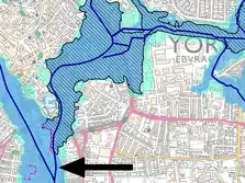 After many years of flash flooding, the York Water Authority commissioned the River Foss Barrier. Work on the barrier commenced in October 1986 and the barrier was opened in November 1988.[3] The main aim of the defence is to prevent back wash from the River Ouse into the River Foss causing flooding upstream of the River Foss.[4]