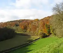 The Frome rises from several springs at Nettleton (about a mile southeast of Birdlip)[5] and in springs at Climperwell Farm (southwest of Brimpsfield). The two branches meet just south of Caudle Green and Syde in Miserden Park,[6] a grade II* listed house with park and garden, which was begun by Sir William Sandys in 1620, and remodelled in the 20th century by Edwin Lutyens after fire damage in 1919.[7] The Frome continues to meander its way south passing the site of Edgeworth Mill and forming the western boundary of Pinbury Park, a wooded area containing early 20th century terraced gardens and a country house dating from the 16th century.[8] It continues to flow to the south and west past disused mills at Henwood and Dorvel to reach Daneway and Sapperton, where the derelict Thames and Severn Canal emerges from Sapperton tunnel. The canal is initially on the north bank of the river, and runs parallel to the river for most of the rest of its course. Holy Brook, which flows southwards, passes under the canal to join the river. As it enters Golden Valley to the north of Frampton Mansell, it is joined by the Golden Valley line, a railway which runs from Swindon to Gloucester and emerges from the Sapperton railway tunnel nearby.[6]