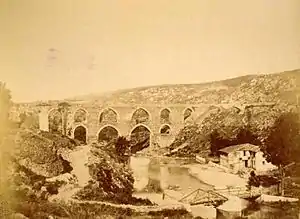 Among these, the stream which rises ten miles south of the castle and flows round the base of its mountain had acquired the name of Meles in modern times and kept it until recently. This stream was alternatively called "Kemer Brook" (Kemer Çayı) or, especially in western sources, as the "Caravan Bridge Brook", by the name of a historic bridge, also celebrated in literature, which checked the entry into the city of İzmir throughout the 19th century. The flow of this stream varies from a full rush of water in winter to a trickle, even a dry bed, in summer.