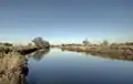 A canalised section of the Tame in Sandwell Valley, showing Forge Mill Lake to the right, separated from the river by a steep embankment.