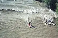 River surfing is the sport of surfing either standing waves, tidal bores or upstream waves in rivers. Claims for its origins include a 1955 ride of 2.4 km (1.5 mi) along the tidal bore of the River Severn.[1]