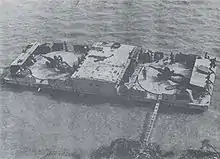 Later, it was established that the LCM-6 was too small to serve effectively, and howitzers were positioned on Navy AMMI pontoon barges. When these proved to difficult to move and to have too deep of a draft, barges formed of Navy P-1 pontoons were the workable solution.[3] M101A1, and later M102 howitzers were mounted onto a baseplate welded to the barge deck, allowing the howitzer to be traversed 360 degrees.