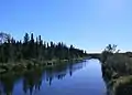 The "Rivière au Saumon" is divided into two arms, the southern branch (Ditton River), near Chartierville and the eastern branch. It is subject to floods and sudden drops, submerging a large expanse of lowland that borders its banks. It was navigated by fishing boats and offered the settlers who lived on its shores a good means of transport (Rouillard, 1914).[2] It is joined by the Ditton River near the village of La Patrie, and continues towards Scotstown, Lingwick, where it is crossed by the McVetty-McKenzie Bridge near Fontainebleau, then flows into the Saint-François River at Weedon. Its flow being more pronounced than that of the Saint-François River, many spring floods occur in this sector.