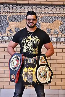 ![]() Riyadh Alazzawi with his, defended 7 times, 3 world heavyweight kickboxing title belts, including: WKN, ISKA and KGP | |