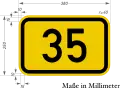 All signs have assigned numbers. The suffix number after the hyphen refers to the variation of the sign; the suffix on signs with variable numbers is the number depicted on the sign (for speed limits, maximum heights, etc.).[2]