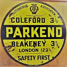 As part of its anti-invasion preparations during World War II, the British government instructed all navigational signposts and railway station signs to be removed, so as not to aid potential enemy ground movements.[2] After the war ended, larger motoring associations embarked upon a programme to erect temporary road signs. These temporary signs, which were not required to conform to the standardisation laid down by the government, usually displayed the motoring association’s logo and colour-scheme.