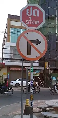Laos traffic signs use Lao, the national language of Laos. However, English is also used for stop and important public places such as tourist attractions, airports, railway stations, and immigration checkpoints. Both Lao and English are used on directional signage.