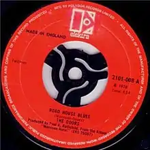 "Roadhouse Blues" is a song by the American rock band the Doors, and appears on the 1970 album Morrison Hotel. It was released as the B-side of "You Make Me Real", which peaked at No. 50 on the U.S. Billboard Hot 100.[3] "Roadhouse Blues" charted in its own right on the Cash Box Top 100, peaking at No. 76.[4] The song became a concert staple for the group and it has been covered by numerous artists.