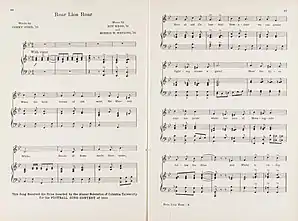 "Roar, Lion, Roar" is the primary fight song of Columbia University. It was originally titled "Bold Buccaneers" and was written with different lyrics for the 1923 Varsity Show Half Moon Inn by Columbia undergraduates Corey Ford and Morris W. Watkins, and alumnus Roy Webb. In order to compete in the Columbia Alumni Federation's contest to find a school fight song the same year, Ford wrote a new set of lyrics that would become "Roar, Lion, Roar". The title references Columbia's mascot, the Columbia Lion.
