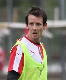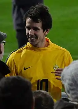 Kruse scored his second international goal in a friendly match against Wales on 10 August 2011, which Australia won 2–1.[36] He scored his third goal against Jordan on 11 June 2013, in a 2014 World Cup qualifier in which Australia won 4–0, and in which he was also Man of the Match, with two more assists on top of his goal.[37] He missed out on a spot in the team for the 2014 FIFA World Cup with an injury.[38]