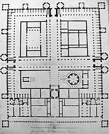 On 3 October 1754, Robert Adam in the company of his brother James (who went as far as Brussels) set off from Edinburgh for his Grand Tour, stopping for a few days in London, where they visited the Mansion House, London, St Stephen Walbrook,[16] St Paul's Cathedral, Windsor, Berkshire, in the company of Thomas Sandby who showed them his landscaping at Windsor Great Park and Virginia Water Lake.[17] They sailed from Dover arriving in Calais[18] on 28 October 1754.[19] He joined Charles Hope-Weir, brother of the Earl of Hopetoun in Brussels[20] and together they travelled to Rome.[21] Hope agreed to take Adam on the tour at the suggestion of his uncle, the Marquess of Annandale, who had undertaken the Grand Tour himself. While in Brussels the pair attended a Play and Masquerade, as well as visiting churches and palaces in the city.[22] Travelling on to Tournai, then Lille, where they visited the Citadal designed by Sébastien Le Prestre de Vauban.[23] By 12 November 1754 Adam and Hope were in Paris where they took lodgings in Hotel de Notre Dame.[24]