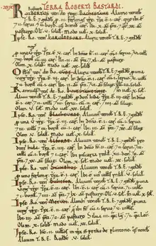 Robert Bastard (fl.1086) (also known as Robert le Bastard, Latinised as Rotbertus / Robertus Bastardus[1]) was a Norman warrior who assisted in the 1066 Norman Conquest of England under King William the Conqueror. He was subsequently rewarded with landholdings in Devonshire and is one of the Devon Domesday Book tenants-in-chief of that monarch,[2] with a holding of 10 manors or estates held in chief, 8 of which he held in demesne, i.e. under his own management without tenants. He had at least one[3] further holding as a mesne tenant, at Goosewell, Plymstock parish, Plympton hundred, held from William of Poilley, a Norman tenant-in-chief from Poilley in Normandy, most of whose 21 landholdings were later granted by King Henry I (1100–1135) to his trusted supporter Richard de Redvers (died 1107), feudal baron of Plympton[4] in Devon.