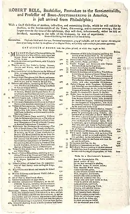 Robert Bell (1732–1784) was a Scottish immigrant to the British colonies in America and became one of many early American printers and publishers active during the years leading up to and through the American Revolution. Bell became widely noted for printing Thomas Paine's celebrated work, Common Sense, a highly influential work during the revolution that openly criticized the British Parliament and their management and taxation of the British-American colonies. Bell and Paine later had a falling out over profits and publication issues.[1][2] As a dedicated patriot, Bell printed many pamphlets and books before and during the revolution, many of which "glowingly" expressed his patriotic views.[3] He also reprinted a number of popular English works, presenting them to the colonies for the first time. He ran an auction house which sold rare books in Lancaster, and in later life he toured the colonies selling off his massive book collection.[3][4] After Bell's death, his printing press and other items were sold at a Philadelphia auction house to another prominent printer at an unusually high price.[5][6]