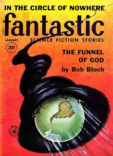 During the 1930s, Bloch was an avid reader of the pulp magazine Weird Tales, which he had discovered at the age of ten in 1927. In the Chicago Northwestern Railroad depot with his parents and aunt Lil, his aunt offered to buy him any magazine he wanted and he picked Weird Tales (Aug 1927 issue) off the newsstand over her shocked protest.[7][8][9] He began his readings of the magazine with the first instalment of Otis Adelbert Kline's "The Bride of Osiris" which dealt with a secret Egyptian city called Karneter located beneath Bloch's birth city of Chicago.[10] The Depression came in the early 1930s. He later recalled, in accepting the Lifetime Achievement Award at the First World Fantasy Convention (1975), how "times were very hard. Weird Tales cost twenty-five cents in a day when most pulp magazines cost a dime. I remember that meant a lot to me." He went on to relate how he would get up very early on the last day of the month, with twenty-five cents saved from his monthly allowance of one dollar, and would run all the way to a combination tobacco/magazine store and buy the new Weird Tales issue, sometimes smuggling it home under his coat if the cover was particularly risqué.[11] His parents were not impressed with Hugh Doak Rankin's sexy covers for the magazine, and when the Bloch family moved to Milwaukee in 1928 young Bloch gradually abandoned his interest. But by the time he had entered high school, he returned to reading Weird Tales during convalescence from flu.[7]
