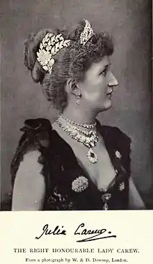 He married Julia Mary Lethbridge, daughter of Albert Arthur Erin Lethbridge and Jane Hill on 27 June 1888 at St. George's, Hanover Square, London. Julia was born in Hamilton, Ontario on 9 October 1863. She spent several years as a child in Persia, where her great-uncle Charles Alison (1810-1872)[2] was British minister. She was educated in England. A miniature of Julia, by C. Turrell, was exhibited at the Royal Academy of Arts, London, 1900. A portrait and sketch of her appeared in "Men and Women of the Day" (London : 1889).[3] The Carew Spinel of the Mughal emperors bought in Persia by her relative was bequeathed to the V&A in 1922 by Lady Carew.[4]