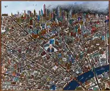 The city became a more important image in his work from 1982 onward and especially the city he knew most, Chicago. The city's "history, politics, sports, architecture, and diverse ethnic traditions"[20] all factored into his compositions. The Chicago Cubs appear in several paintings. Mayor Washington leads the St. Patrick's Day parade down Michigan Avenue in St. Patrick's Day (1983). Street of Big Dreams (1983) captures the grid street plan of the city along with some of its famous buildings.[20] New York was an important subject matter as well; Donley filled large canvases with the architecture of that city and portraits of New Yorkers: the street vendors, policemen, tourists, the Mets and the Yankees. These urban landscapes continued to evolve and change. The compositions took on more figures, both actual people from the cities and those from Donley's imagination. The figures also became larger, sometimes eclipsing the buildings.[21] There are still tiny figures on the streets, but these are often cartoonish and engaging in activities that are "positively bizarre."[22] Like the work in the 1970s, they are still crammed with images, "buildings, cars, and people,"[22] but the focus is the city. In the late 1990s, Donley was still working with images of the city. As James Yood wrote in Artforum, "Donley has chosen a grand, challenging, and unwieldy theme for his work... no less than the life of the modern city, as manifested in its buildings and in its residents."[23] But by this point, Chicago and New York were not his only subject matter. He also painted Las Vegas, Los Angeles, San Francisco, and most recently, Portland, Oregon. As Donley said in a 1990 article, he has "always been fascinated by the energy of the city in both its growth and decay."[6]
