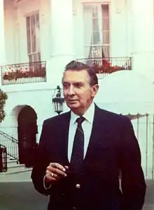Following his term as bureau chief, Thompson moved his family to Seattle and took up the post as publisher of the (now defunct) Seattle Post-Intelligencer from 1974 to 1978. He also served as a juror for the Pulitzer Prize from 1975 to 1976.[3] While he enjoyed running his own paper, after only four years in Seattle he missed being in the heart of the political landscape and writing about Washington politics. In 1978 he moved the family back to Washington, D.C. and reclaimed his former position as bureau chief for Hearst, which he held until 1989.[3] During this period he would fly to China once with President Ronald Reagan and once with President George H.W. Bush. One day following a seating chart, President Ronald Reagan called upon Thompson at a White House press conference. Unbeknownst to him, Thompson was sitting with his wife at home in his robe and slippers, a glass of wine in his hand watching the televised conference from the comfort of his favorite chair. Without missing a beat when he heard his name, Thompson dutifully stood and raised his glass toward Reagan's TV image in salute.[6]