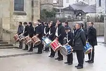 In the year following his departure from the French Sports and Cultural Federation, Robert Goute was one of the founding members of the French Confederation of Drum Bands (CFBF) in 1980.[9] In 1986, Edgar Faure, president of the organizing committee of the celebrations of the French Revolution wanted a parade of 2,000 drums on the Champs-Élysées on July 14, 1989. Robert Goute was asked by Jean-Paul Goude to help organize the band within his show. He composed the drum program[10] and Wally Badarou organized the instrumental part.
