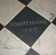 On 3 March 1703 Hooke died in London, having been blind and bedridden during the last year of his life. A chest containing £8,000 in money and gold was found in his room at Gresham College.[lower-alpha 5] Although he had talked of leaving a generous bequest to the Royal Society, which would have given his name to a library, laboratory and lectures, no will was found and the money passed to a cousin, Elizabeth Stephens.[34] Hooke was buried at St Helen's Bishopsgate, but the precise location of his grave is unknown.
