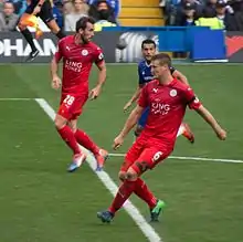 Huth completed a permanent transfer to Leicester on 24 June 2015, signing a three-year contract for an undisclosed fee, reported to be £3 million.[91][92] The following 13 January, he scored his first goal of the season for the title-chasing Foxes, heading in Christian Fuchs' corner for the only goal of the game at Tottenham.[93] On 6 February, he scored twice in a 3–1 win at title rivals Manchester City, putting Leicester six points clear at the top of the table.[94] Leicester won the title at 5,000–1 odds, and Huth became only the seventh player to win the Premier League with two different teams.[95] He missed only three league games as a result of a retrospective three-match suspension by The FA for pulling Marouane Fellaini's hair during a 1–1 draw at Manchester United on 1 May 2016.[96]