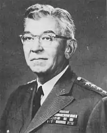 On September 1, 1962, he succeeded General Williston B. Palmer as director of the military assistance program in the office of the Assistant Secretary of Defense for International Security Affairs, with rank of full general. The Director of Military Assistance supervised the operational details of arms transfer to NATO allies and other friendly countries, as guided by the State Department. As chief of staff of the foreign military aid program, he was considered to be on the same level as the chiefs of staff of the Army, Navy, and Air Force and of comparable military rank, but without a seat on the Joint Chiefs of Staff.[10] When Wood retired, the position was downgraded to three stars and eventually its title was changed to deputy assistant secretary of defense (international security affairs) for military assistance and sales.[11]