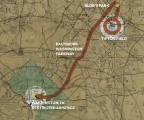 Preston flew low over the restaurant he had visited earlier, then briefly touched down in a nearby field where his hat was later recovered. He then decided to visit Washington, D.C., 20 miles (32 km) southwest, by following the lights of the Baltimore–Washington Parkway. Preston's helicopter was first discovered by the District of Columbia police when he was spotted hovering between the United States Capitol and the Lincoln Memorial. Flight over this area was strictly prohibited, but this was not enforced in any significant way at the time; surface-to-air missiles were not installed around Washington until after the September 11 attacks. Preston spent 5–6 minutes hovering a couple of feet above the Washington Monument's grounds, then flew over the Capitol, and went on to follow Pennsylvania Avenue to the White House.[1][3] The Secret Service policy, at the time, was to fire at aerial intruders, but when to do so was left vague—especially if it could harm bystanders. While Preston was hovering above and briefly touched down on the South Lawn, the White House Executive Office control center watch officer, Henry S. Kulbaski, attempted to contact his superiors by phone but received no answer. After the helicopter departed, Kulbaski ordered his agents to shoot it down if it returned.[2]