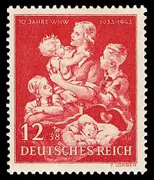 1943 wartime German stamp showing a mother with her offspring. The ideal number of children per family according to the RDF was not less than four